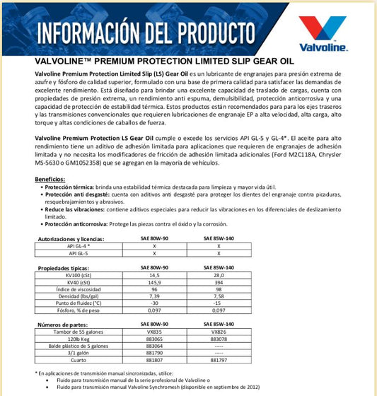 Aceite para transmision manual y diferencial SAE 85W140 946ml Valvoline